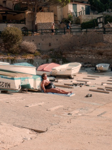 Il est de ces endroits où l’été est permanent, où tout semble être en harmonie. Lorsque je me suis rendu dans les calanques abritant les cabanons pour la première fois, j’ai ressenti une sensation familière. Il y règne une atmosphère paisible où chaque élément semble être à sa place depuis toujours, comme si rien ne bougeait dans ces décors désuets, abimés par le passage du vent, du sel et du soleil. L’inertie du temps sur ces endroits est rassurante, à quelque pas d’une métropole qui se métamorphose vite, il est réconfortant de pouvoir se mettre à l’abri dans ces lieux qui ne changent pas. Ces lieux qui nous invitent à ralentir, à profiter d’une vie plus simple, à se retrouver ensemble et à contempler des scènes suspendues dans le temps. Passé, présent, les deux se rencontrent ici et brouillent les pistes pour nous faire voyager au rythme des vagues, des cigales et des cliquetis des verres qui trinquent. « Le cabanon ça ne se raconte pas, le cabanon c’est toute notre vie (…) le cabanon c’est un endroit où on y fait des blagues, où on y fait des bouillabaisses, on y chante, on vient y jouer la partie de boules. C’est une chose le cabanon, comment vous le dire ? C’est bien difficile, il faut le vivre…. Si un jour vous avez l’occasion, venez ! Et vous savez, c’est pas sûr que vous retourniez ailleurs après… Oh oh oh ! Là il vont rester ici si tu leur parles comme ça (…) Tu crois ? C’est pas possible, peut-être ils supportent même pas le soleil. Va savoir ! ». 1979 : Les cabanons de Marseille | Archive INA Jusqu’à récemment, les cabanons ne s’achetaient pas, ils se transmettaient de génération en génération de pêcheurs. Depuis une dizaine d’années, la quiétude de ces lieux est menacée. L’application de la Loi Littoral entraine la destruction de cabanons bordant les côtes marseillaises et la spéculation des prix, conséquence du regain de popularité récent de la cité phocéenne, poussent les cabanonniers historiques à vendre. Et pourtant, il y règne toujours une sensation d’été permanent.