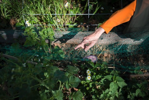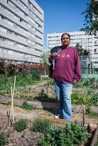 A your boy takes care of a hen around the pedagogical plot of the Agrocité, a community garden (also called ‘jardin partagé’ in French) located in the social housing neighborhood of Les Agnettes. Gennevillers, Île-de-France, France, April 2019.