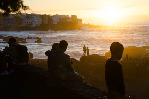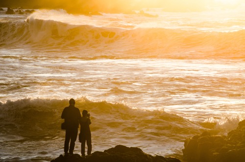 Playa de Benijo, Anaga, Tenerife, Iles Canaries. Un couple de jeunes mariés captés pendant l'heure dorée qui envahi littéralement cette magnifique zone