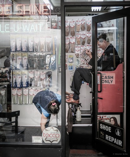 Cette image m'inspire une métaphore tissée par les éléments graphiques de la composition. Les briques, le store, la fenêtre, la climatisation, représentent la technologie qui se fait une place intégrale et logique dans notre quotidien, avec une simplicité presque banale. Au centre, l’homme-orchestre aux pieds en éventails, qui se laisse guider de manière simple et sans effort par le progrès.