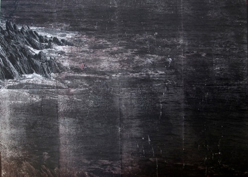 Le monde et son équilibre. Le paysage prend corps dans la photographie repeinte, griffée sur la toile. Cliquetis, bruit du monde, la sphère qui tourne, qui ralentit, qui gravite. Images reconstruites, décomposées, assemblées comme un puzzle. Le monde et son équilibre incertain. Le traitement brutal de l’image lorsque l’on se rapproche de la toile, une métaphore de l’actualité.