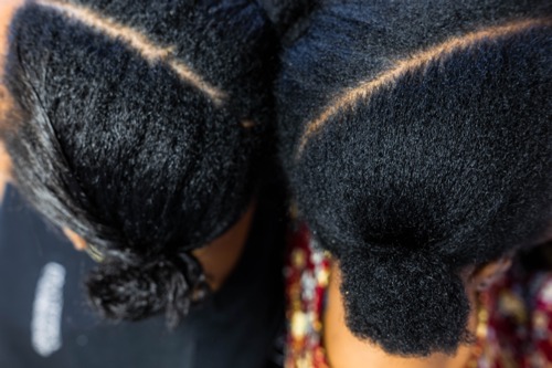 Entre midi et deux, certaines lycéennes préfèrent investir le couloir pour grignoter et rester entre copines. Entre autres activités, elles aiment bien s'occuper de leurs cheveux.