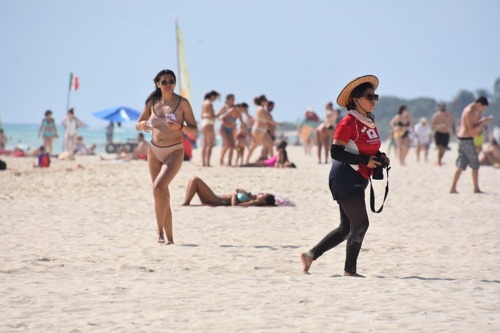 Ladies in red walking on a Mexican beach this autumn