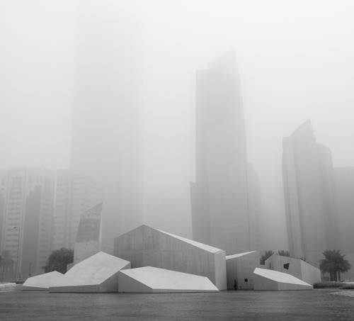 Abu Dhabi tot le matin; la boum envahit la ville, laissant seulement dépasser les immeubles les plus hauts. Photo prise du 62 eme étage du World Trade Center