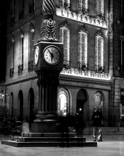 Place de l'horloge à Bordeaux 2018. Lors des manifestations des "gilets jaunes", un manifestant s'est approché de cette horloge symbolique de la place à Bordeaux et a brandi un drapeau Français.